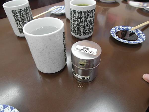 茶飲也很特別,是熱開水撒上旁間的綠茶粉,攪一攪就變熱綠茶